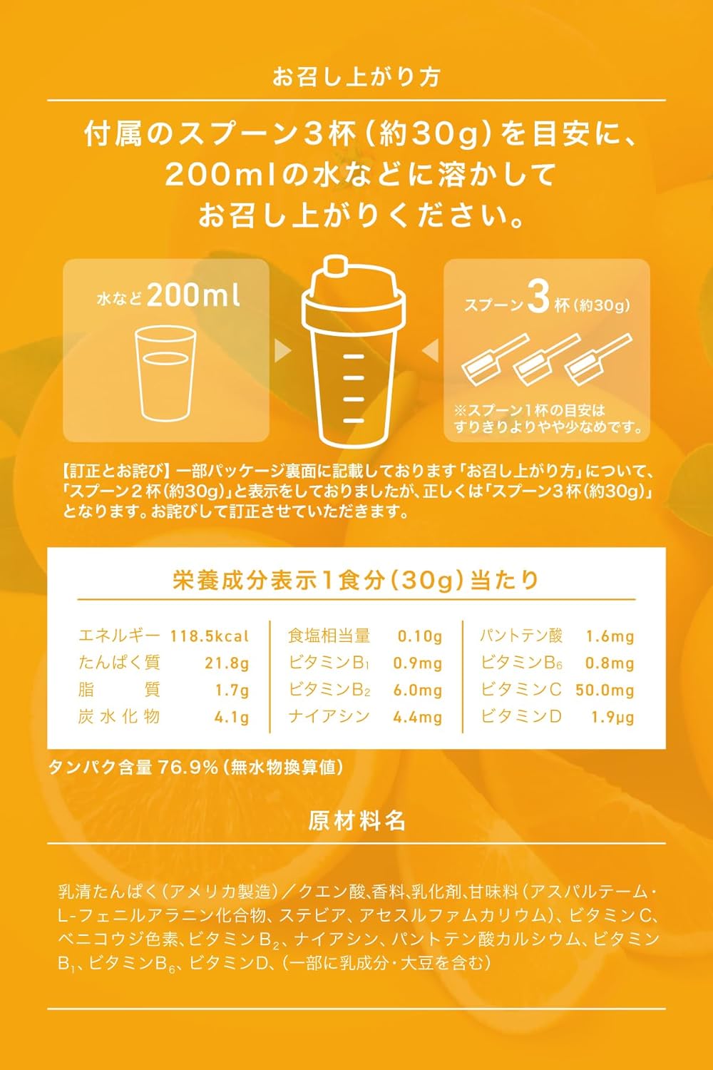 【厳選されたホエイプロテイン100%使用】たんぱく原料として吸収スピードの速いホエイプロテインを100%使用。1食(製品30g)あたりタンパク質21.8g。さらに毎日に欠かせない7種類のビタミン(V.B1,V.B2,V.B6,V.C,V.D,ナイアシン,パントテン酸)を配合。